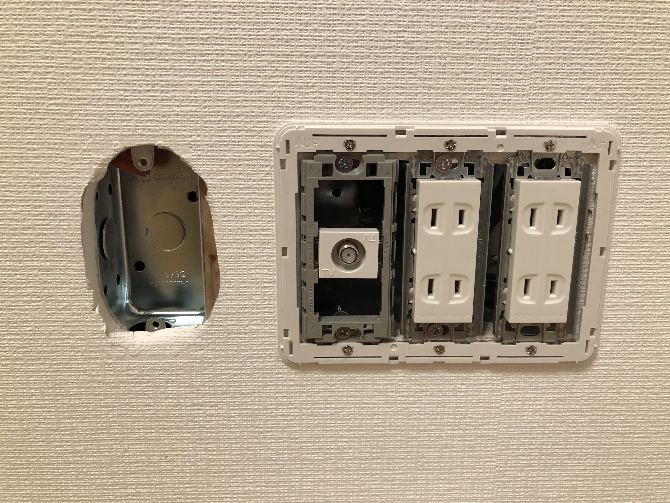 無駄に時間だけを費やしてしまったが、ここで冷静に考えると点検口とコンセントの配管口が一致してないのではないか?となりのコンセントパネルを開けてみると…こちらにも配管口ありました…マジかぁ~時間返せ~